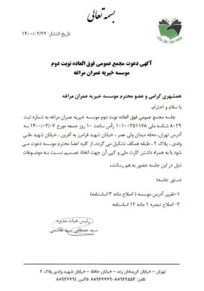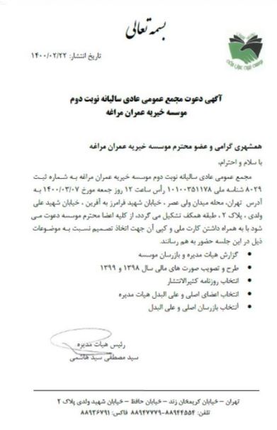 در سال هائی که سپری شد متاسفانه پیش آمدن شرایط خاص در کشور که ناشی از تبعات همه گیری بیماری کرونا بود اغلب فعالیتها و ارتباطات را تحت شعاع قرار داد و به جهت الزام رعایت ضوابط تعیین شده هیئت مدیره را از دیدار حضوری عزیزان همشهری بینصیب کرد ولیکن در سایه فضل پروردگار و برنامهریزیها و تلاشهایی که صورت گرفت با بهرهگیری از ظرفیت فضای مجازی و ارتباطات غیر حضوری سعی گردید به نحوی شایسته خلل پیش آمده جبران شود و در این راستا هیات مدیره و عوامل اجرائی موسسه سعی نمودند با نگهداری و بروزسانی سایت و ایجاد سه کانال در پیام رسان های فعال به نام "موسسه خیریه عمران مراغه" و تماسهای تلفنی و پیامکی و چاپ و انتشار مرتب نشریه مراغه نامه جهت ارائه گزارش فعالیت ها و استفاده از نظرات و پیشنهادات اعضای محترم ارتباطات را حفظ و تداوم بخشد۰ که به اجمال به شرح زیرجهت اطلاع اعضاء محترم تقدیم می گردد.
